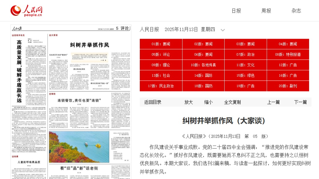 作风建设关乎事业成败。党的二十届四中全会强调:“推进党的作风建设常态化长效化。”抓好作风建设,既需要驰而不息纠不正之风,也需要持之以恒树优良新风。本期大家谈,我们选刊3篇来稿,与读者一起探讨,如何更好实现纠树并举抓作风。 ——编者 杜绝商而不办的“假把式” 刘佳跃 协同是推进工作的重要方法。实践中存在一种现象:有的非牵头部门或置身事外,或拖延搪塞,导致商而不办,工作悬空。 细究背后的思想根源,主要有三。一是规避责任。一些涉及多部门的工作,是难啃的“硬骨头”、难接的“烫手山芋”,推进起来难度不小。有的部门为求“安稳”,怕担责任,搞形式参与、不实质推进的“假把式”。二是计较得失。有的部门心存顾虑:“事情办成,功劳是别人的;办不好,却要共同担责。”在这种“功不归我、过可能及我”的心态驱使下,能推就推,消极应付。三是本位主义作祟。“各家自扫门前雪,莫管他人瓦上霜”的观念仍有影响,只顾经营自己的“一亩三分地”。 越是难解的问题,越需要合力攻坚;越是复杂的工作,越需要做好协同配合。协同,是要求也是职责,是智慧也见境界。杜绝类似的“假把式”,就必须切实树立一盘棋意识,多从大处着眼,多算大