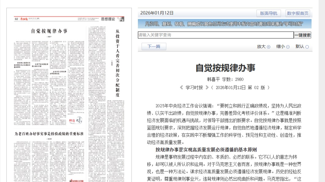 2025年中央经济工作会议强调:“要树立和践行正确政绩观,坚持为人民出政绩、以实干出政绩,自觉按规律办事,完善差异化考核评价体系。”这是精准判断经济发展面临的机遇与挑战,对领导干部提出的新要求。自觉按规律办事就是按照蓝图规划要求,深刻把握经济发展运行规律,自觉自然地遵循经济规律,制定科学合理的经济政策,在实践中不断增强工作的科学性、预见性和主动性、创造性,推动经济高质量发展。按规律办事是实现高质量发展必须遵循的基本原则规律是事物发展过程中内在的、本质的、必然的联系。它不以人的意志为转移,却可以被人所认识和运用。对于马克思主义者而言,按规律办事既是一种世界观,也是一种方法论。谋求经济高质量发展必须遵循经济发展规律。历史的经验反复证明,尊重规律则事业兴,违背规律则必然出现曲折和问题。马克思指出,“这种按一定比例分配社会劳动的必要性,决不可能被社会生产的一定形式所取消,而可能改变的只是它的表现形式”。这句话深刻阐明按比例分配社会劳动是客观经济规律,不以社会形态为转移,仅实现形式会随生产方式变化而不同。按规律办事,是马克思主义科学精神的集中体现。马克思主义的科学性,就在于它揭示了人类社会发展的