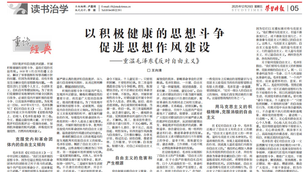 用好批评和自我批评武器,开展积极健康的思想斗争,是我们党的优良传统。1935年1月召开的遵义会议,解决了军事指挥和军事战略方针的问题,但因为战事紧迫,没有来得及完全解决党的思想路线问题。一些党员言行上呈现个人主义、小团体主义、自私自利等错误倾向。为了使我们党能够切实地领导和开展全民族抗日战争,必须在党内开展积极的思想斗争,以克服各种错误思想。为实现这一目标,1937年9月7日,毛泽东撰写了《反对自由主义》一文,发表在抗日军政大学内部刊物《思想战线》上,后收入《毛泽东选集》第二卷。今天,重温这篇经典文献,对于用好批评和自我批评这一党强身治病、保持肌体健康的锐利武器,淬炼党员坚强党性,仍然具有现实意义。克服党内和革命团体内的自由主义倾向毛泽东在《反对自由主义》一文中开宗明义地指出:“我们主张积极的思想斗争,因为它是达到党内和革命团体内的团结使之利于战斗的武器。每个共产党员和革命分子,应该拿起这个武器。”积极的思想斗争是通过开展严肃认真的批评和自我批评,深入进行自我审视和剖析,从而达到明辨是非、增强团结的目的。积极的思想斗争不但是共产党人发现并纠正错误、锤炼和增强党性的重要方法,而且是广大党