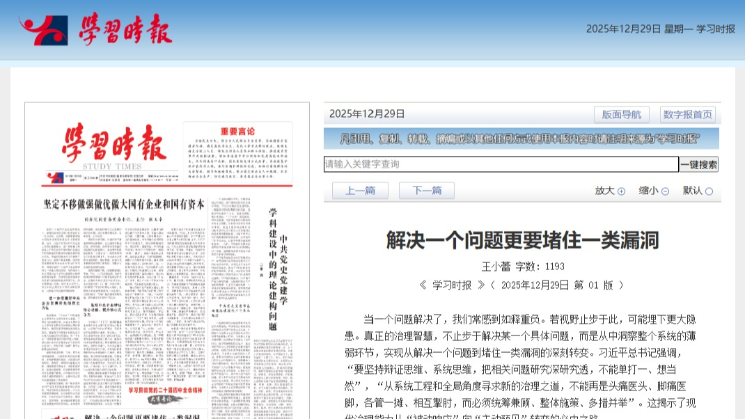 当一个问题解决了,我们常感到如释重负。若视野止步于此,可能埋下更大隐患。真正的治理智慧,不止步于解决某一个具体问题,而是从中洞察整个系统的薄弱环节,实现从解决一个问题到堵住一类漏洞的深刻转变。习近平总书记强调,“要坚持辩证思维、系统思维,把相关问题研究深研究透,不能单打一、想当然”,“从系统工程和全局角度寻求新的治理之道,不能再是头痛医头、脚痛医脚,各管一摊、相互掣肘,而必须统筹兼顾、整体施策、多措并举”。这揭示了现代治理能力从“被动响应”向“主动预见”转变的必由之路。现代社会是高风险社会,风险高度隐匿,呈现强耦合性,传导加速,会由单一问题演变为系统性震荡。衡量治理现代化的标尺,不在于解决了多少个矛盾问题,而在于堵住漏洞的效率是否越来越高,同样错误能否不再重演,政府、企业、群众能否主动参与,个案教训能否上升为制度标准。因此,一个问题的解决是“治标”,一类漏洞的封堵才是“治本”。孤立解决个案只能暂时平息矛盾,如果不从制度层面堵塞漏洞、从顶层设计上作出长期规划,同类问题就会陷入“治理—反弹—再治理”的循环怪圈。实践充分证明,聚焦重点领域、薄弱环节,举一反三开展自查自纠,由解决一个问题向解决
