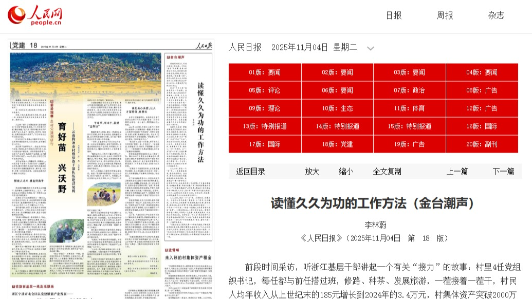 前段时间采访,听浙江基层干部讲起一个有关“接力”的故事:村里4任党组织书记,每任都与前任搭过班,修路、种茶、发展旅游,一茬接着一茬干,村民人均年收入从上世纪末的185元增长到2024年的3.4万元,村集体资产突破2000万元。这是“千万工程”造福于民的一个缩影。20多年来,浙江当地党员干部锚定一件事,久久为功、不懈奋斗,书写了万千乡村的蝶变故事。从一个村的接力奋斗到一个省的接续推进,不禁联想到最近的热词——“规划”。科学制定和接续实施五年规划,是我们党治国理政的重要经验,也是中国特色社会主义的制度优势所在。这背后蕴含着久久为功的思想方法和工作方法。何谓久久为功?事物发展有其客观规律,滴水穿石、绳锯木断,靠的正是绵绵用力的耐心与坚持。久久为功,不是“不为”“慢为”,而是“常为”“久为”,是给成长以空间、给发展以时间。越是宏大的目标,越需要沉下来、稳住心,一步一个脚印。从“一五”到“十四五”,从基本解决人民温饱问题,到人民生活总体达到小康水平,再到全面建成小康社会,我们党每5年一个台阶、接续奋斗,这就是历史耐心和战略定力。久久为功,贵在一个“准”字。一张蓝图绘到底,首先要看得准。2020年