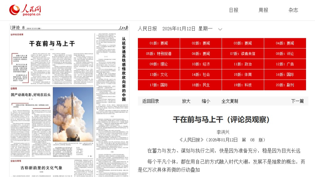 在蓄力与发力、谋划与执行之间,快是因为准备充分,稳是因为目光长远每个平凡个体,都在用自己的方式融入时代大潮。发展不是抽象的概念,而是亿万次具体而微的行动叠加开年就要开动,开局就要开跑。即刻出发、奋力赶路,是为了给明天一个交代每到年初,很多人会给自己写一份新年寄语、列一张心愿清单。2026年来了,在“想要”与“得到”之间,如何“做到”?那就是:想在前,就要干在前;干在前,最好马上干。这恰是立行立办的即时感。今天的中国,给人很强的即时感。清晨,第一班高铁早早地发车鸣笛;日间,各类数据信息、人员物资在高效流动;深夜,高校院所的实验室里,闪烁着未熄的灯光。线下,企业费尽心思把新的科研成果转化应用;网上,直播间里回响着“农”字号产品热销的乡音。即时即干,就在眼前;实干奋斗,为了明天。都说中国发展的速度快,这个速度不仅体现在日新月异的变化中,更在“看准了就抓紧干”的决心里。2025年中央经济工作会议上,习近平总书记强调:“党中央关于明年经济工作的思路、任务、政策,是经过充分论证、反复研究提出的。定了就要落实。”“定了就要落实”,需要更好统筹方向感与紧迫感。真正的效率,不是低头抢跑,而是在正确方向上