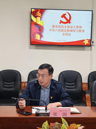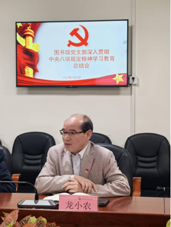 最后,图书馆党支部书记龙小农作总结发言。他首先对机关党委副书记张润的出席指导和中肯点评表示衷心感谢;认为图书馆党支部通过全员参与、全员学习,思想得到淬炼、政治得到历练、党性得到锤炼、作风得到提炼,图书馆工作呈现出全新风貌。围绕如何巩固拓展学习教育成果,他对全体党员提出三点要求:第一,要深化认识,提高政治站位,深刻认识学习贯彻落实中央八项规定精神的极端重要性,不断推动作风建设向纵深发展;第二,要始终保持持续学习的态度,不断学习党的最新理论成果,推进理论创新和观念更新,党员持续深入学习是始终与党中央保持高度一致、同频共振的关键;第三,要大力推动学习成果的转化应用,全体党员在日常工作中自觉以中央八项规定精神为行为准则和标尺,将学习成效切实转化为提升服务质量、优化管理效能、推动图书馆事业高质量发展的实际行动,以过硬作风和优异业绩体现党员的先锋模范带头作用。